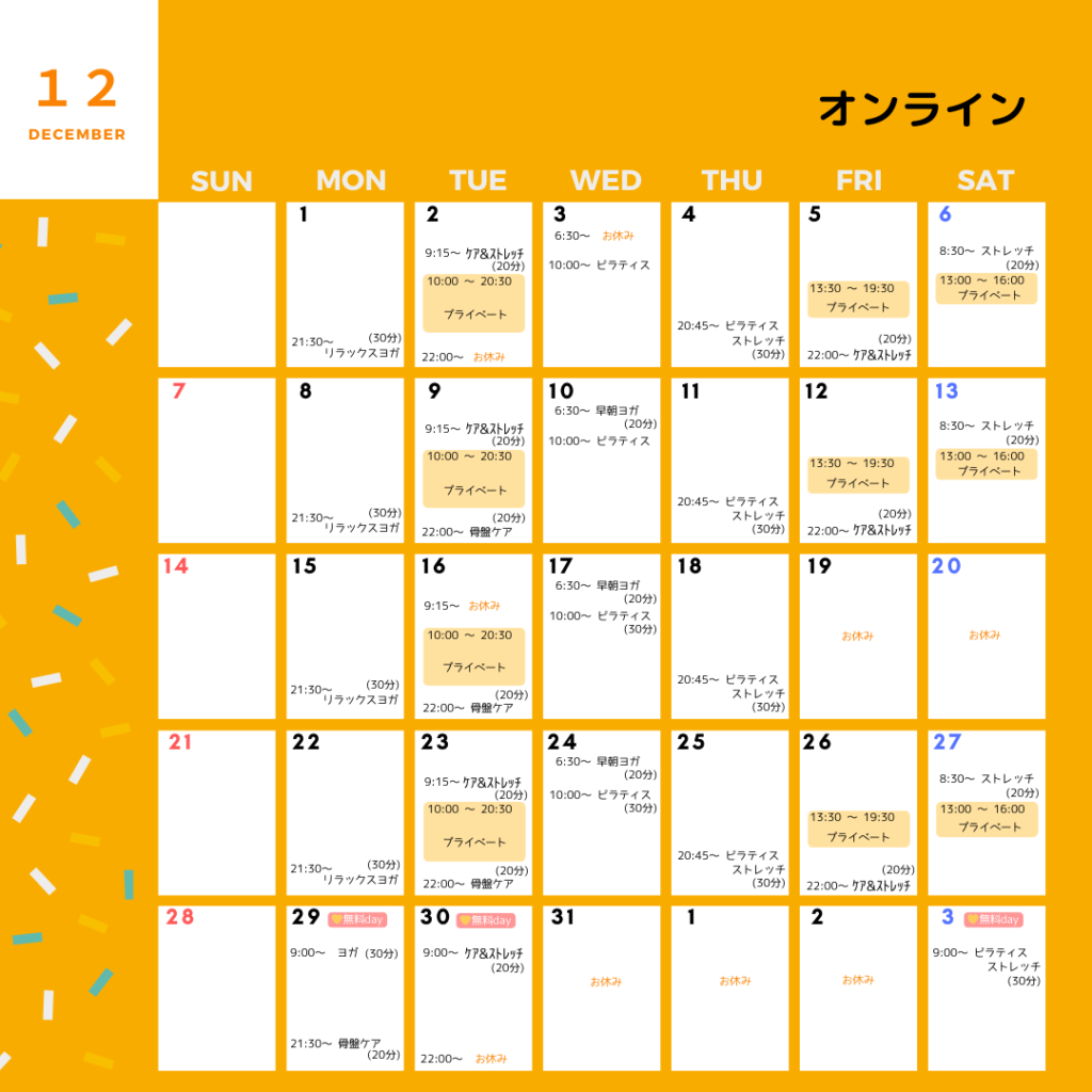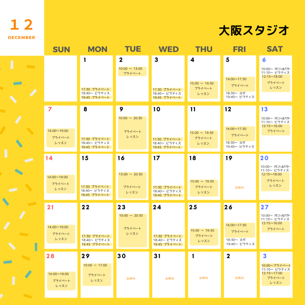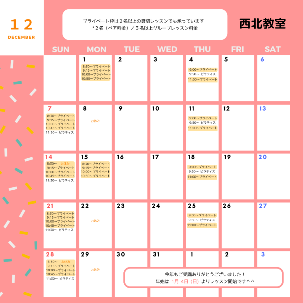 新着情報 【最新】12月のスケジュール決定しました! douceur YUKI 2025-11-27 今後の状況により各スタジオ・教室のレッスンとも途中で変更や休講となる場合がありますので予めご了承ください。 11月のスケジュールはこちら 大阪スタジオ 定員枠が少ないため予約が重なった場合で、週2回以上の受講予定がある方には調整をお願いする場合があります。予めご了承ください。 大阪スタジオ:料金など詳細はこちら 西北教室 西北教室:料金など詳細はこちら オンラインレッスン オンラインレッスン:詳細はこちら単発でもご受講いただけます。単発でのお申込みはこちらから